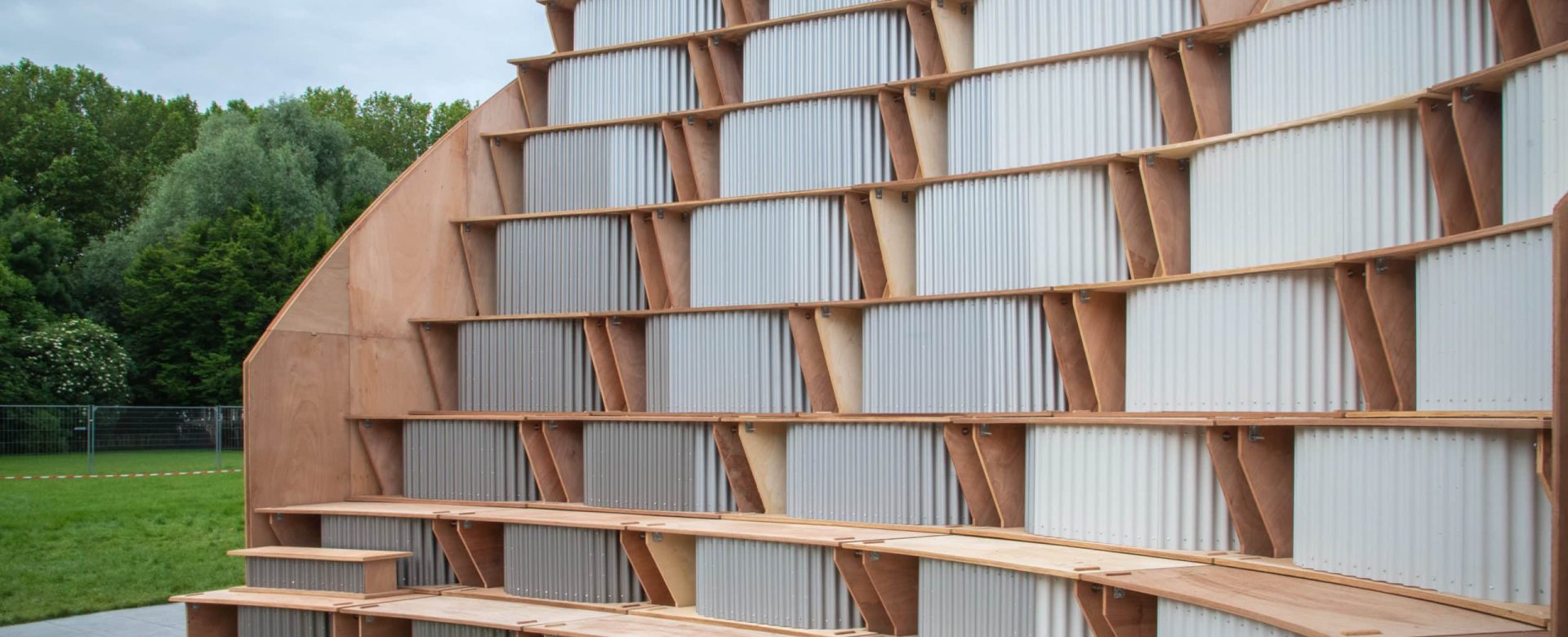 Ce pavillon, conçu dans le cadre du projet Archifolies lors des JO de Paris 2024, a été conçu par les étudiants de l’ENSA Paris-Malaquais. Il a abrité les événements de la Fédération Française d’Escrime à l’été 2024 dans le parc de la Villette. Ce pavillon 100% préfabriqué, à l’aide des outils de fabrication à commande numérique, est composé de modules mixtes de tôle ondulée, issus de réemploi, et de contreplaqué déclassé. Il est composé de modules mixtes tôle ondulée – contreplaquée, formant des caissons qui reposent sur une série de refends à ossature bois.