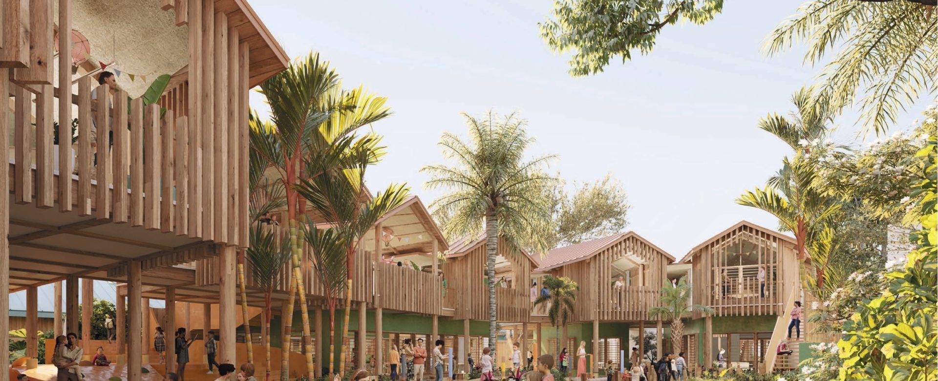 The Ariste Bolon School consists of a kindergarten and a primary school designed as wooden-frame cabins on two levels (G+1), set within a green and cool landscaped island.
