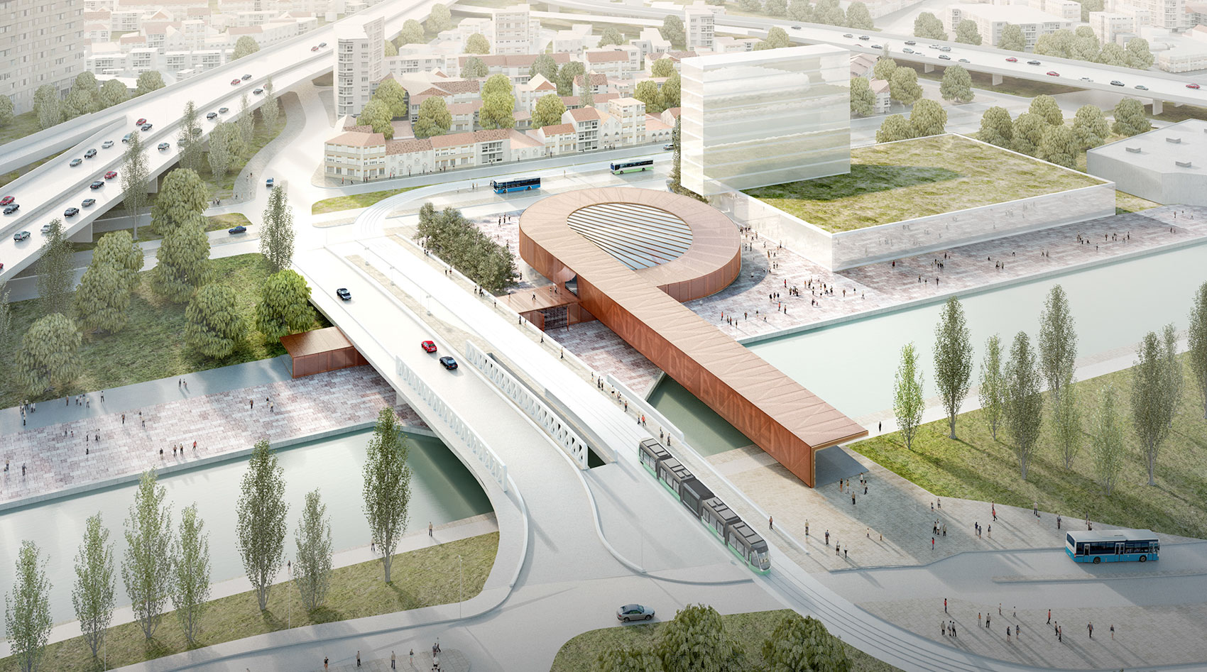 The facades and roofs are entirely copper-clad. The panels are perforated when combined with a glass façade to create a double skin façade. The deck level is connected at floor level by a helical ramp that revolves around a central void. The transparent ETFE roof allows natural light to reach the subway level 35 meters below.