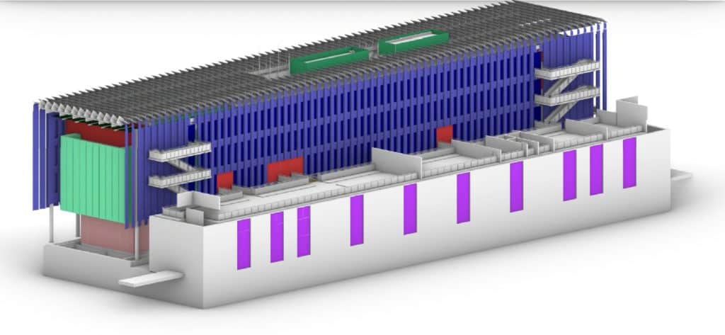 - Un niveau d’infrastructure en béton abritant le parking et de nombreux locaux techniques.