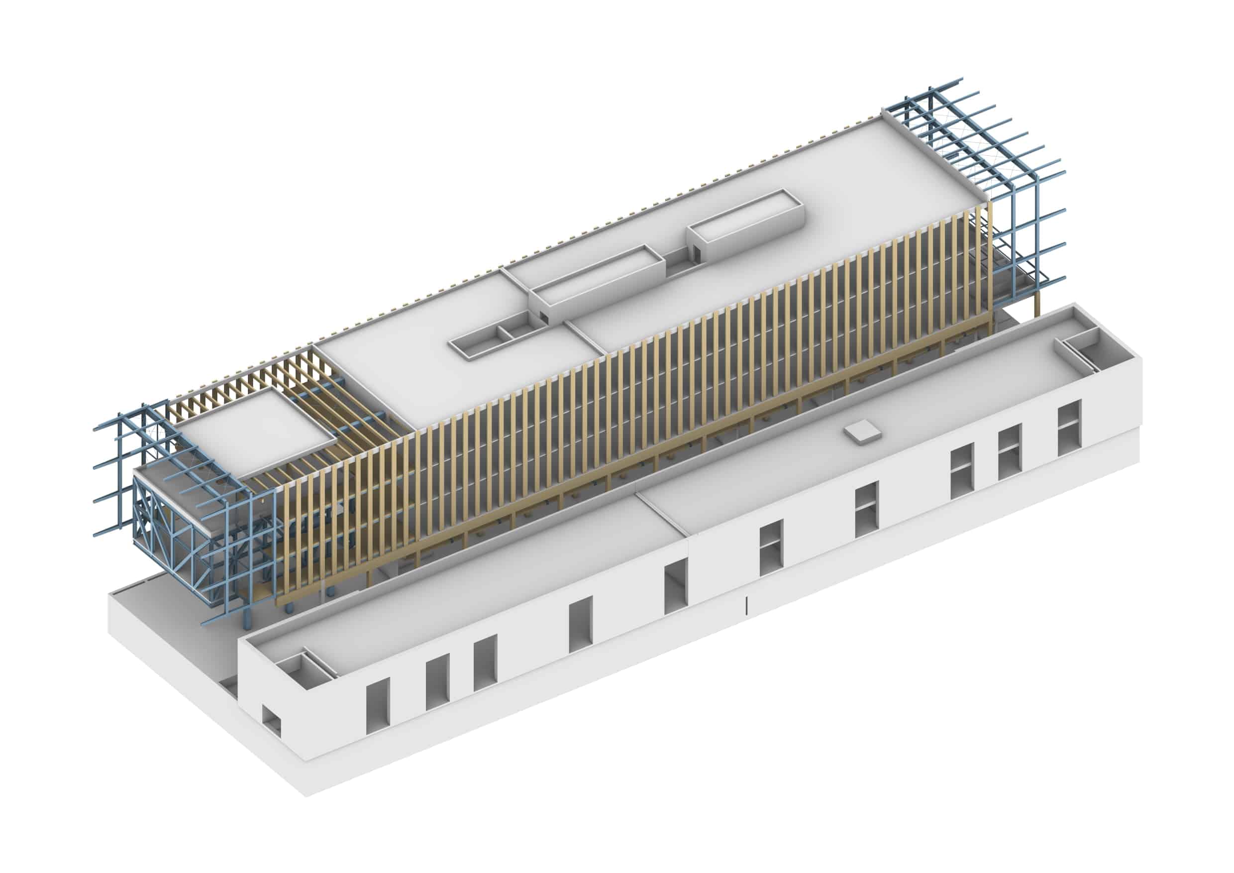 - Un pôle tertiaire sur la grande majorité côté sud du bâtiment. Cette superstructure majoritairement en bois apparent est composée en partie courante d’une ossature poteau/poutre en bois lamellé-collé intérieure, de trumeaux porteurs CLT en façade, de planchers mixtes bois/béton nervurés ou CLT et de noyaux en béton au niveau des circulations verticales.
