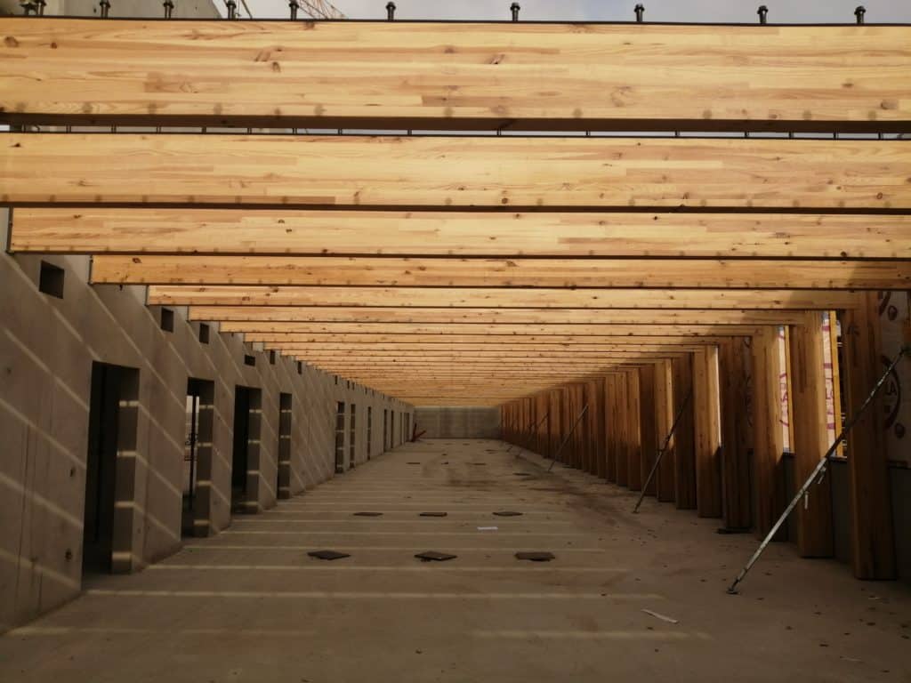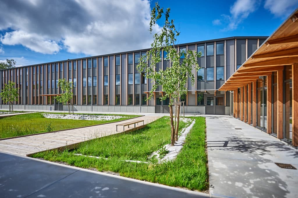 Les bâtiments classes sont réalisés en planchers connectés béton sur solives en bois lamellé collé, afin d’atteindre les objectifs incendie et acoustique.