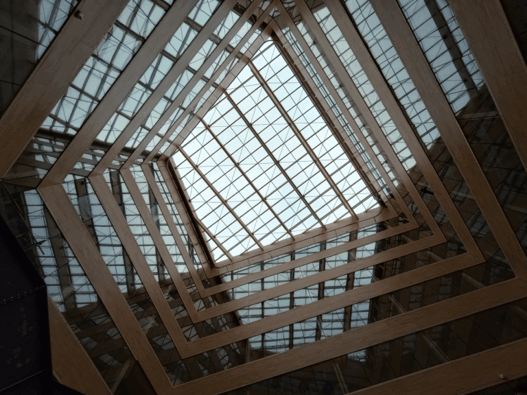 Les poutres principales, réalisées en bois lamellé-collé, couvrent des portées allant jusqu’à 25 m et présentent une hauteur d’environ 1,35 m. Entre ces poutres principales, des chevrons également en bois lamellé-collé viennent compléter la trame structurelle, formant une grille architecturale harmonieuse qui structure la verrière tout en lui conférant un aspect chaleureux. Des tirants en acier viennent contreventer la structure de la verrière.