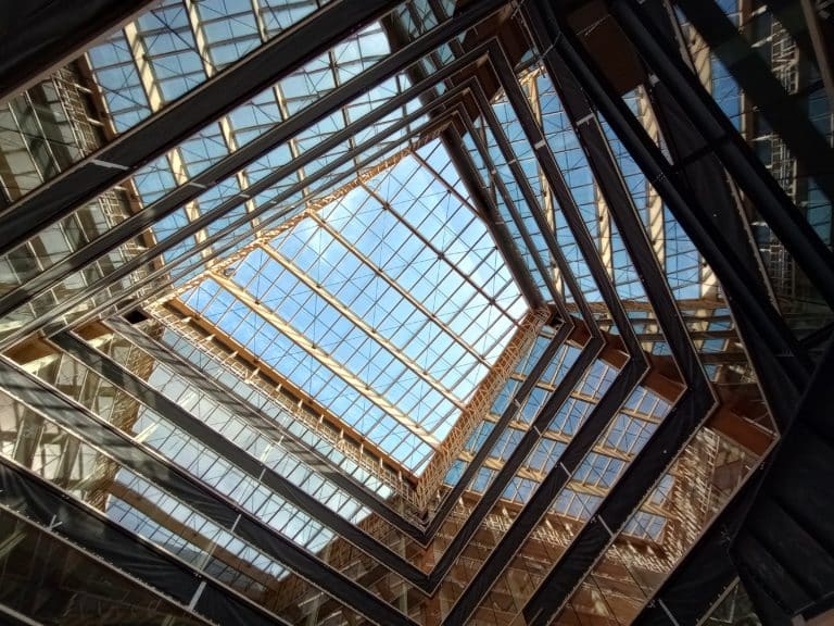 Elioth a participé à la conception et au suivi de l’exécution de la verrière à ossature bois recouvrant l’atrium du bâtiment. Cette verrière apporte un éclairage naturel généreux sur l’ensemble des niveaux bordant le vide intérieur et contribue au confort visuel et à l’ambiance lumineuse de l’espace central.