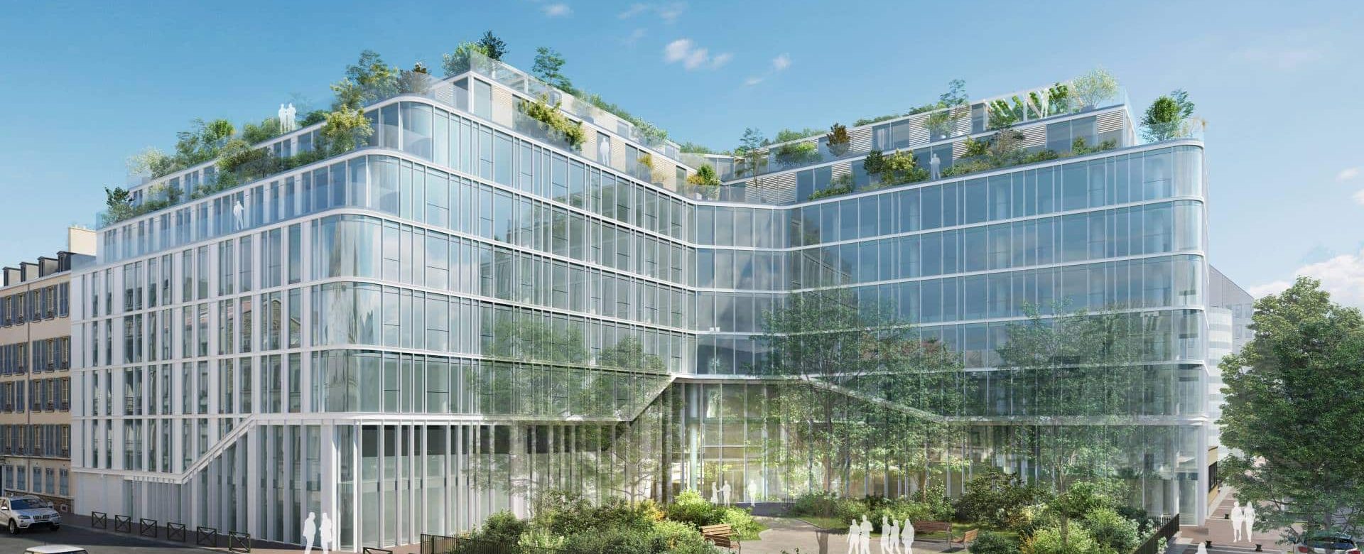 Bâtiment de bureaux de 1989 enserré entre deux squares. Les façades sont intégralement remplacées afin d’améliorer la transparence et les performances de l’enveloppe, dans un souci architectural d’homogénéité : le verre omniprésent est tantôt transparent, tantôt opaque pour répondre aux usages intérieurs et aux contraintes solaires.