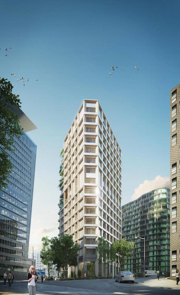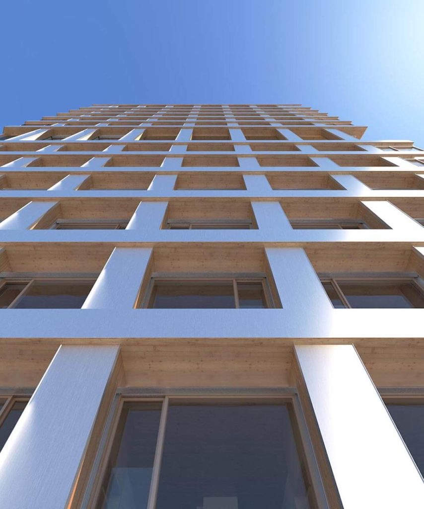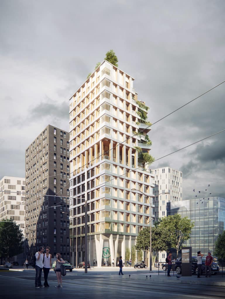 Le projet est un immeuble démonstrateur de construction bois de grande hauteur. Cette tour de logement étudiant en R+15 est portée par une structure mixte bois – acier – béton avec un large emploi de planchers bois. Son enveloppe est réalisée en Façade à Ossature Bois.