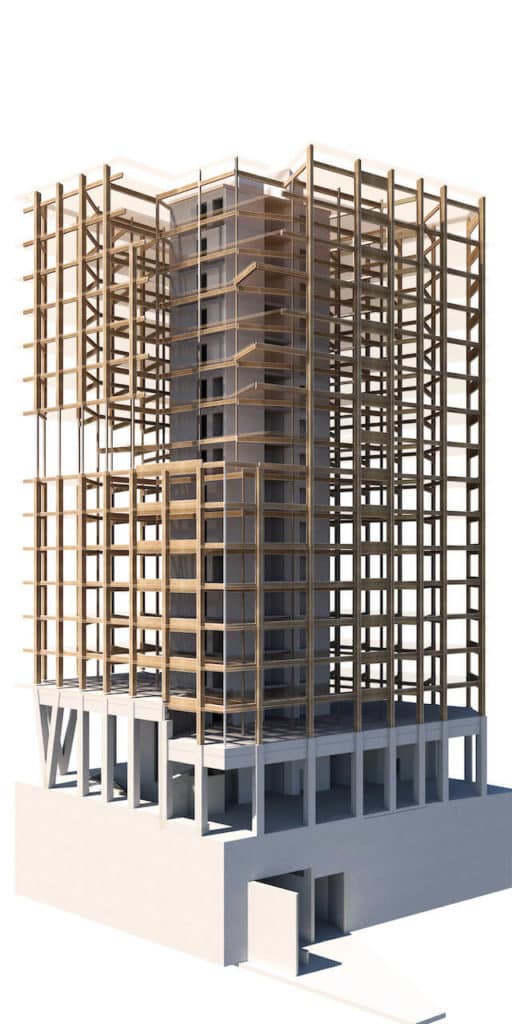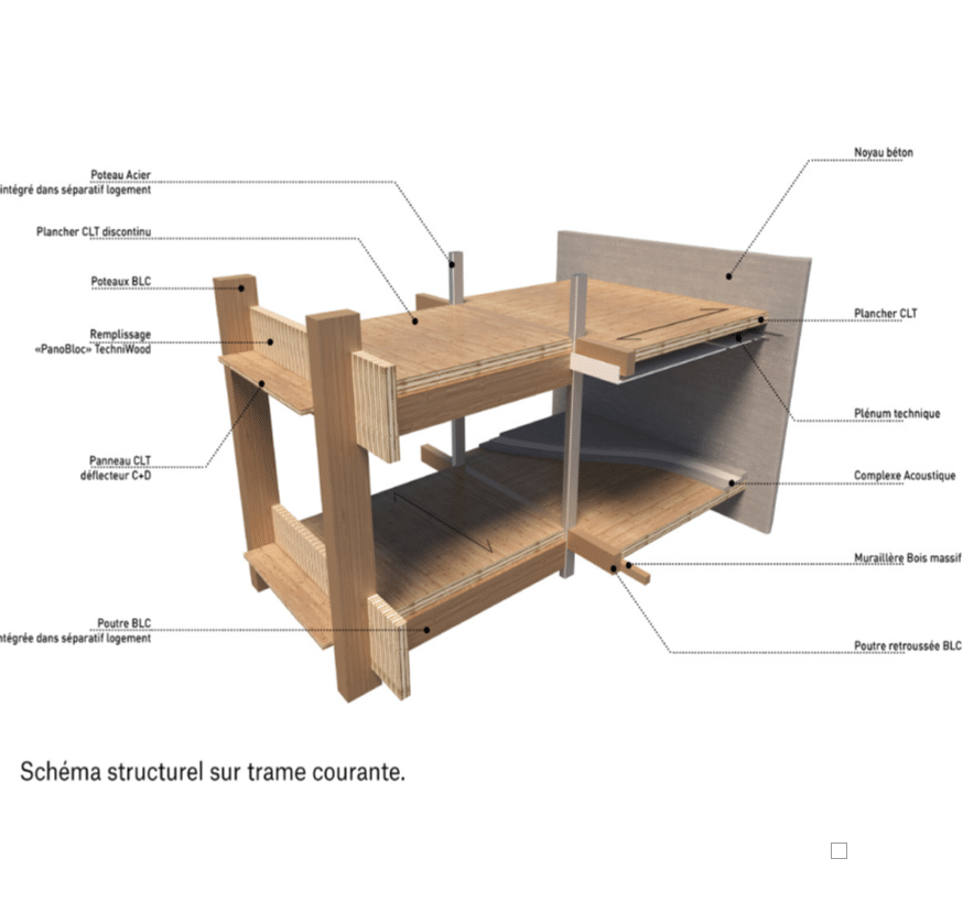 Tour contreventée par un noyau béton, structure porteuse en béton armé et planchers bois.