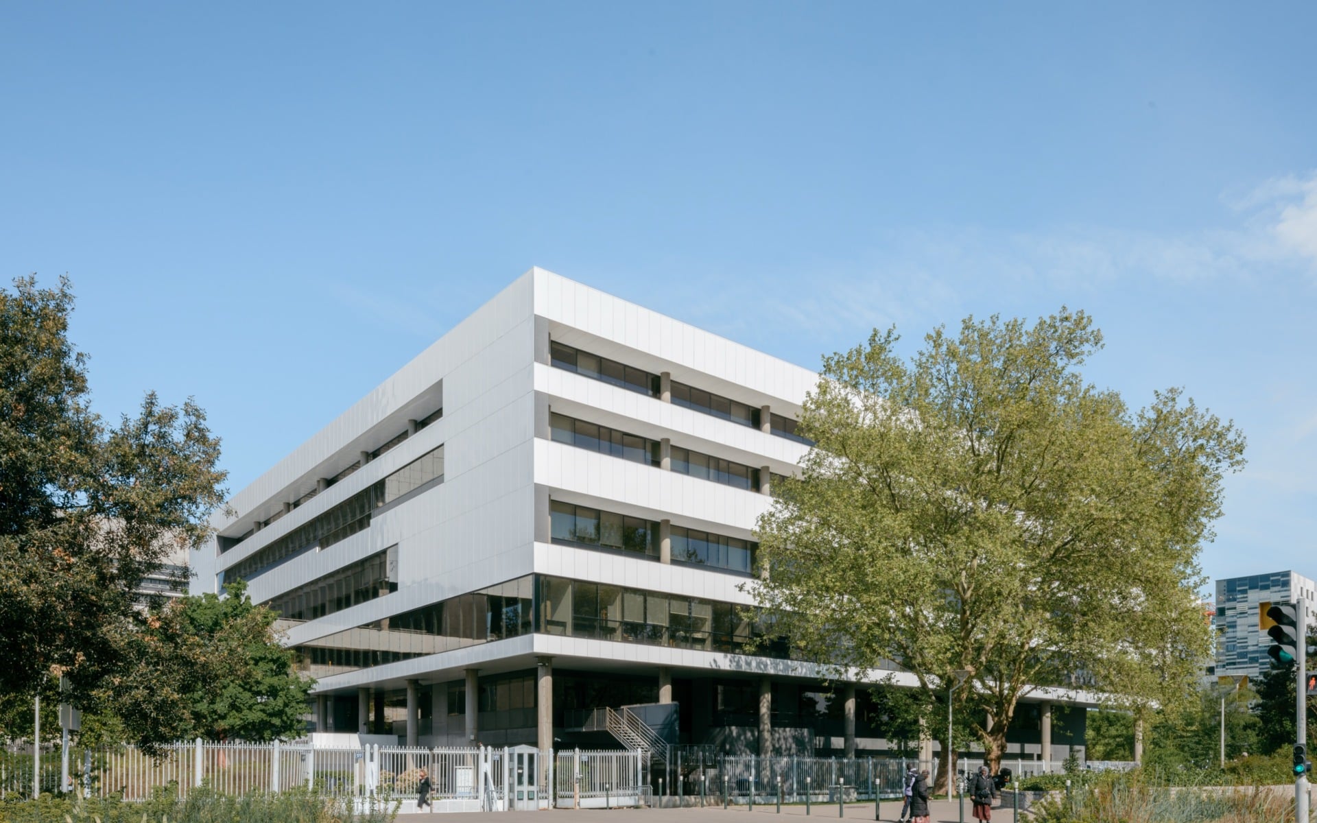 Le bâtiment, de forme rectangulaire et doté d’un atrium central, présente une façade caractérisée par une alternance de bandes horizontales vitrées avec des vitrages foncés et teintés dans la masse et des parties opaques en relief constituées principalement de cassettes aluminium blanches.